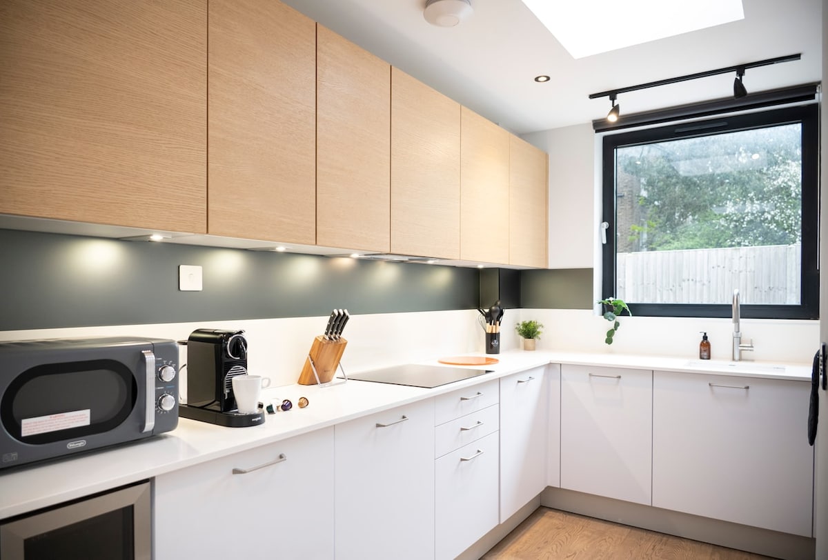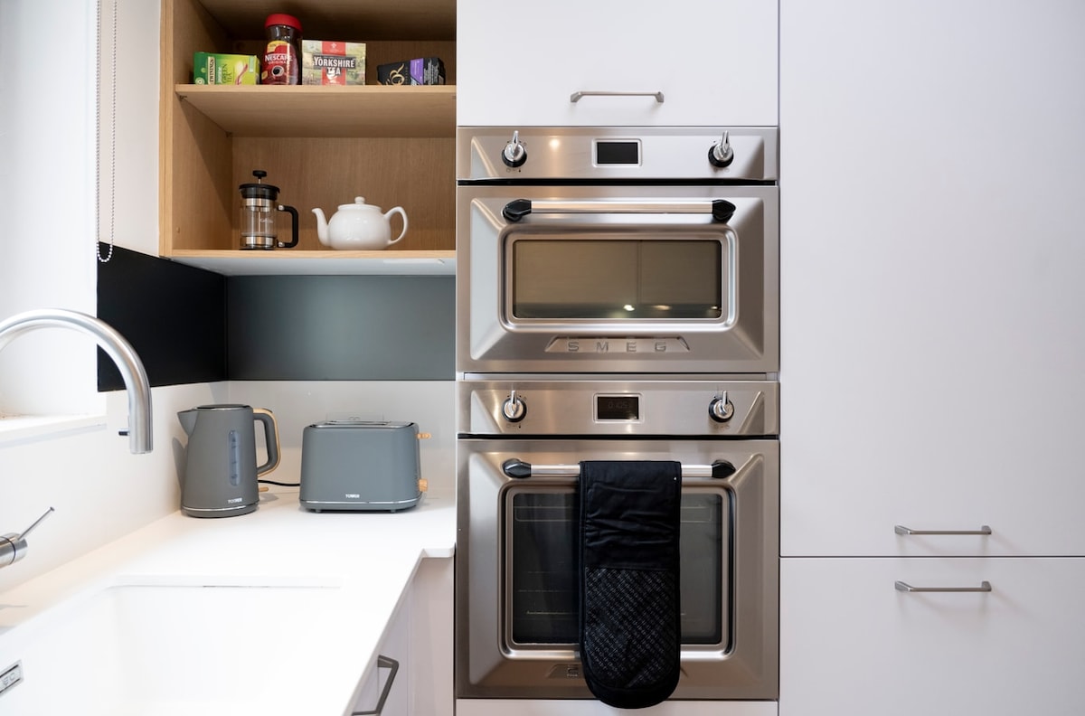 - A fully equipped kitchen with a Nespresso machine, dishwasher, microwave, induction cooker, oven, kettle, and a toaster.