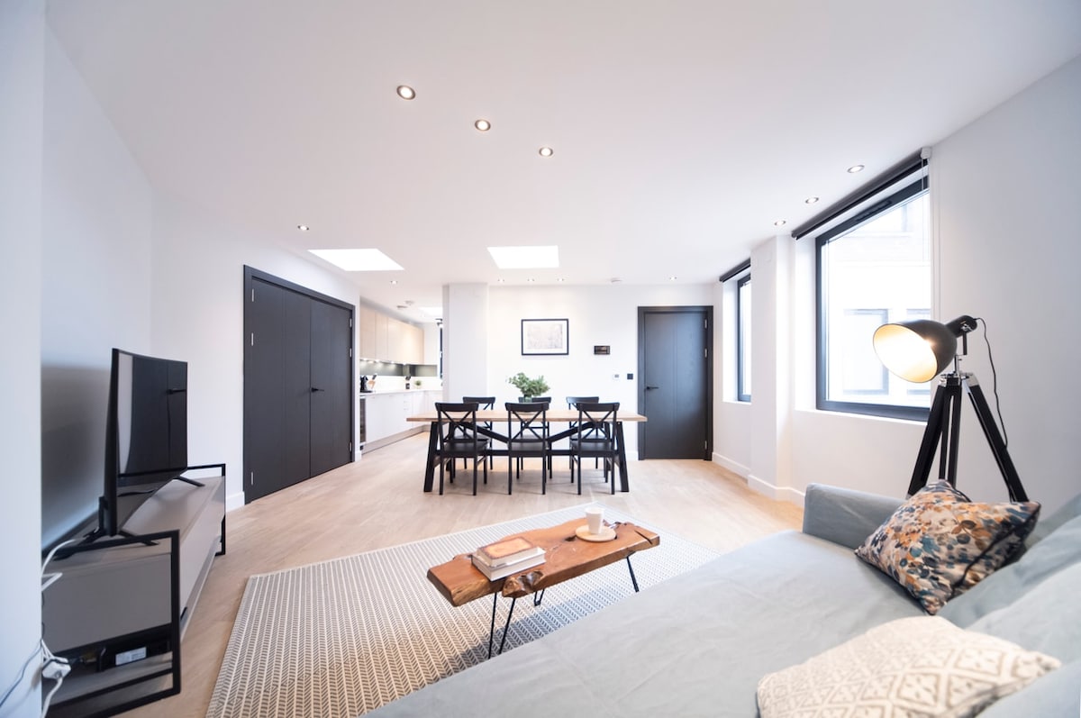 - An open living area with a comfy sofa, a Smart TV, a dining table with six chairs and a floor lamp.