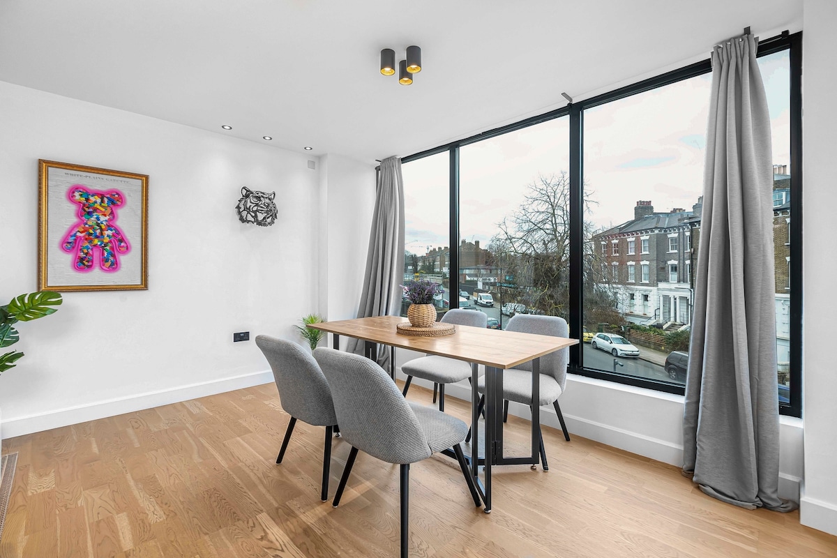 Bright and modern, this flat is perfect for 4 guests. It has 2 bathrooms and a balcony with lift access. The primary bedroom includes a king bed, ensuite bathroom, and private balcony, while the second bedroom offers another comfortable king bed. The open-plan living area features a cosy sofa, Smart TV and dining table for four. The fully equipped kitchen is ready for all your cooking needs. Walk to Kentish Town tube station in just 5 minutes and enjoy fast Fibre WiFi throughout the space.