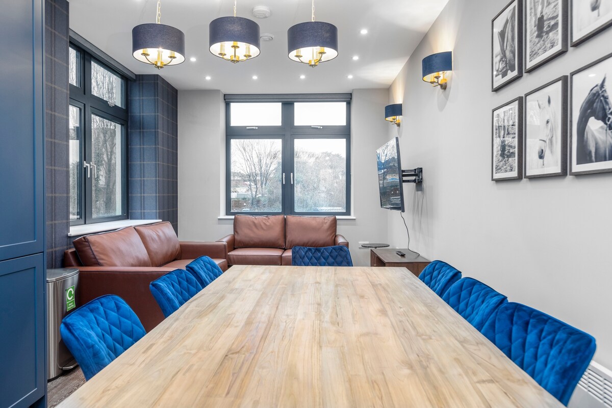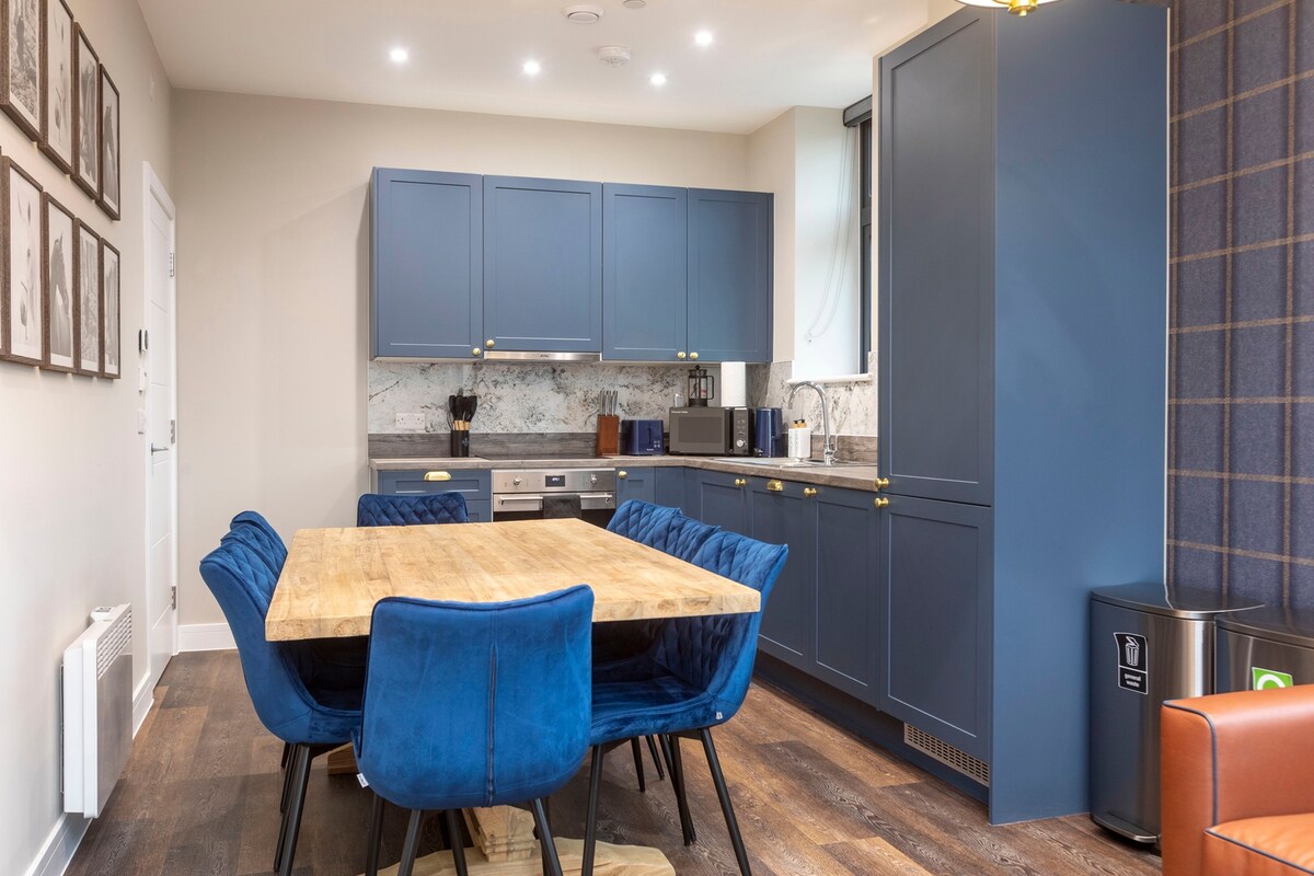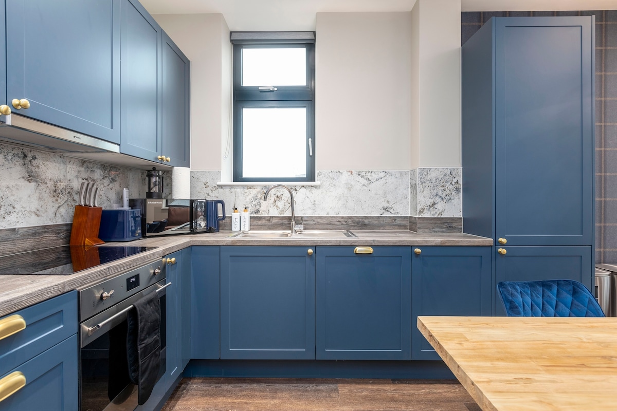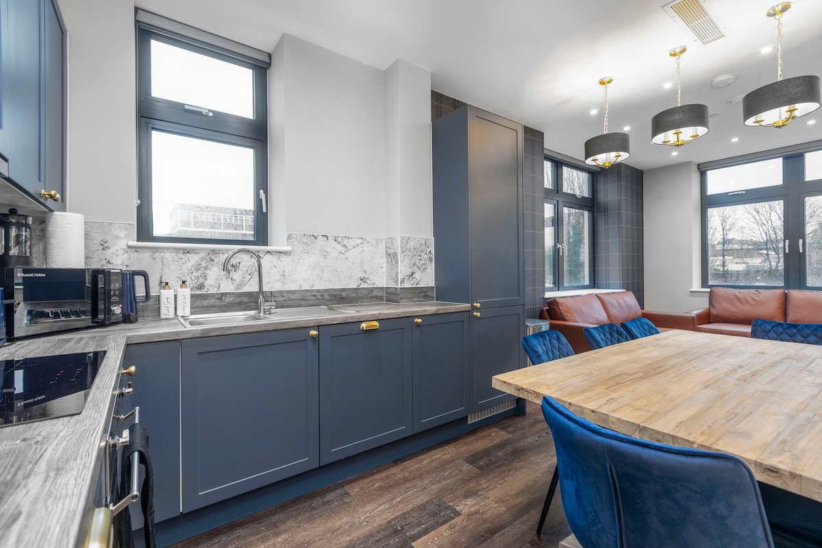 - Fully equipped kitchen with induction hob, oven, fridge, freezer, kettle, toaster, microwave, dishwasher, and coffee machine.