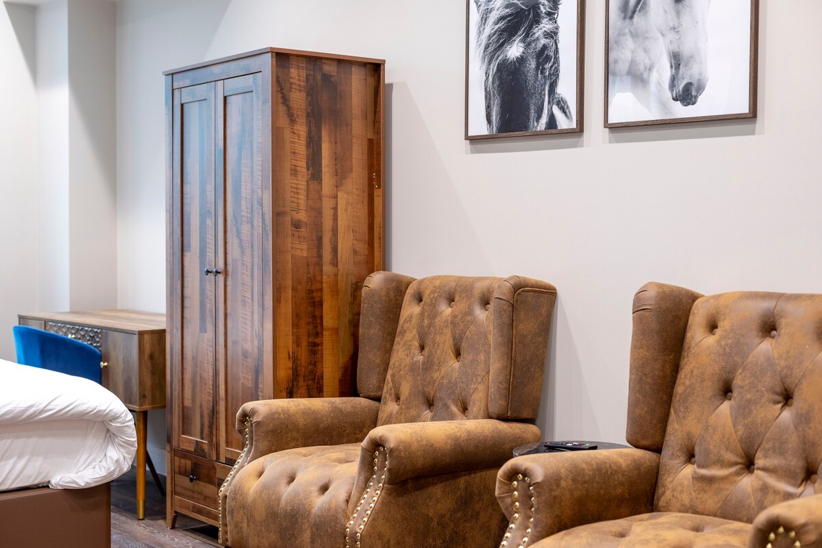 - Living area with sofa-bed, coffee table, and Smart TV.