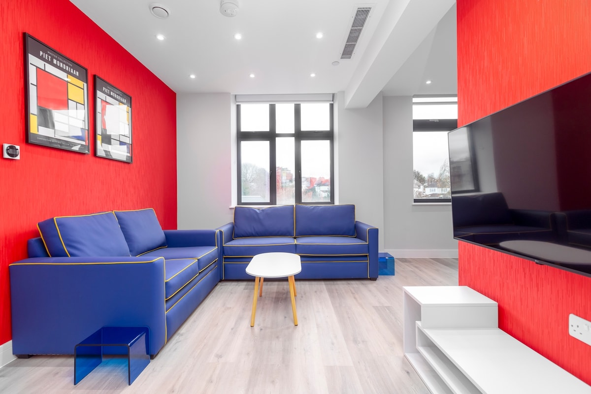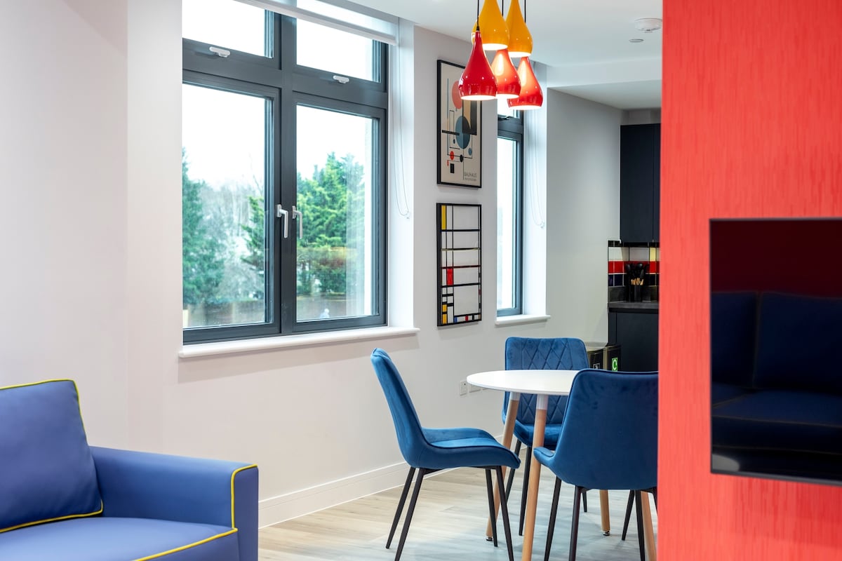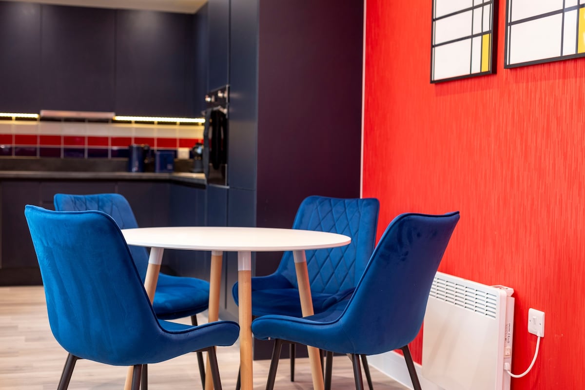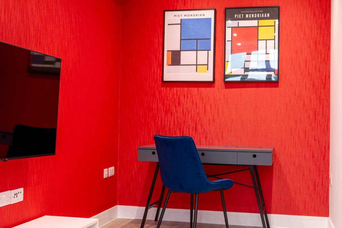 Unique 1-Bed, 1-Bath flat in Orpington, newly refurbished in the vibrant style of artist Mondrian! Bright, spacious, and full of colour, this high-standard flat features a fully equipped kitchen, an airy living area, and plenty of artistic charm. Located in a modern building with lifts and free parking, you’ll also enjoy air conditioning, fast WiFi, a Super-King bed (180 x 200 cm) and a Whirlpool bathtub.
