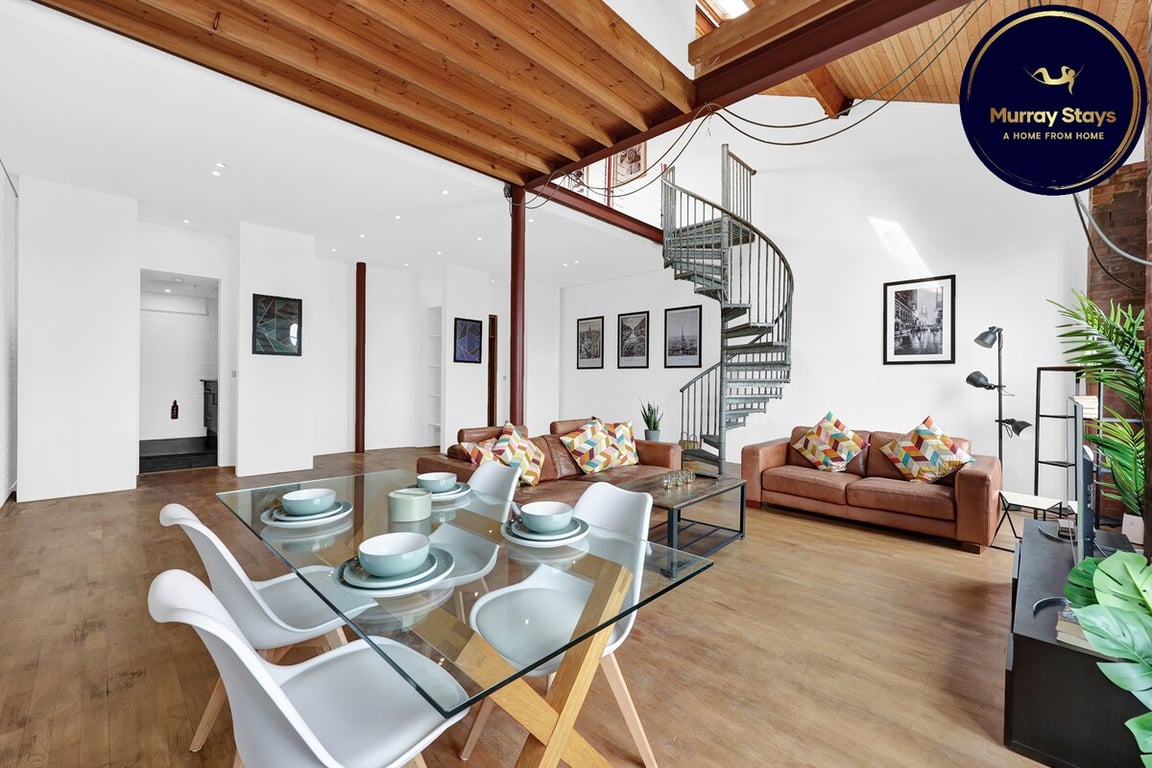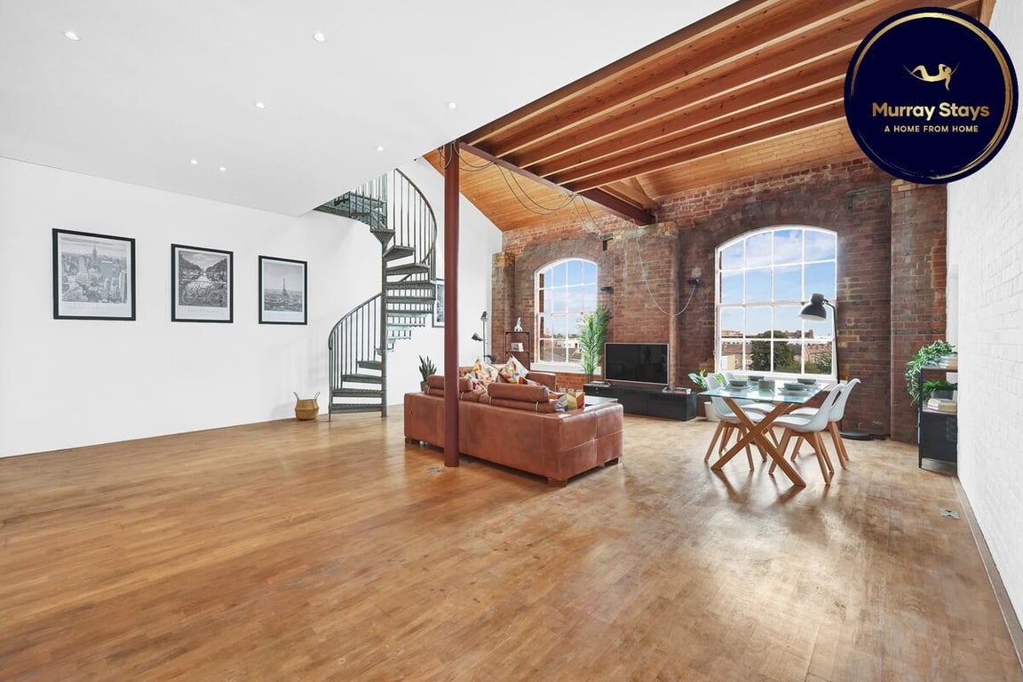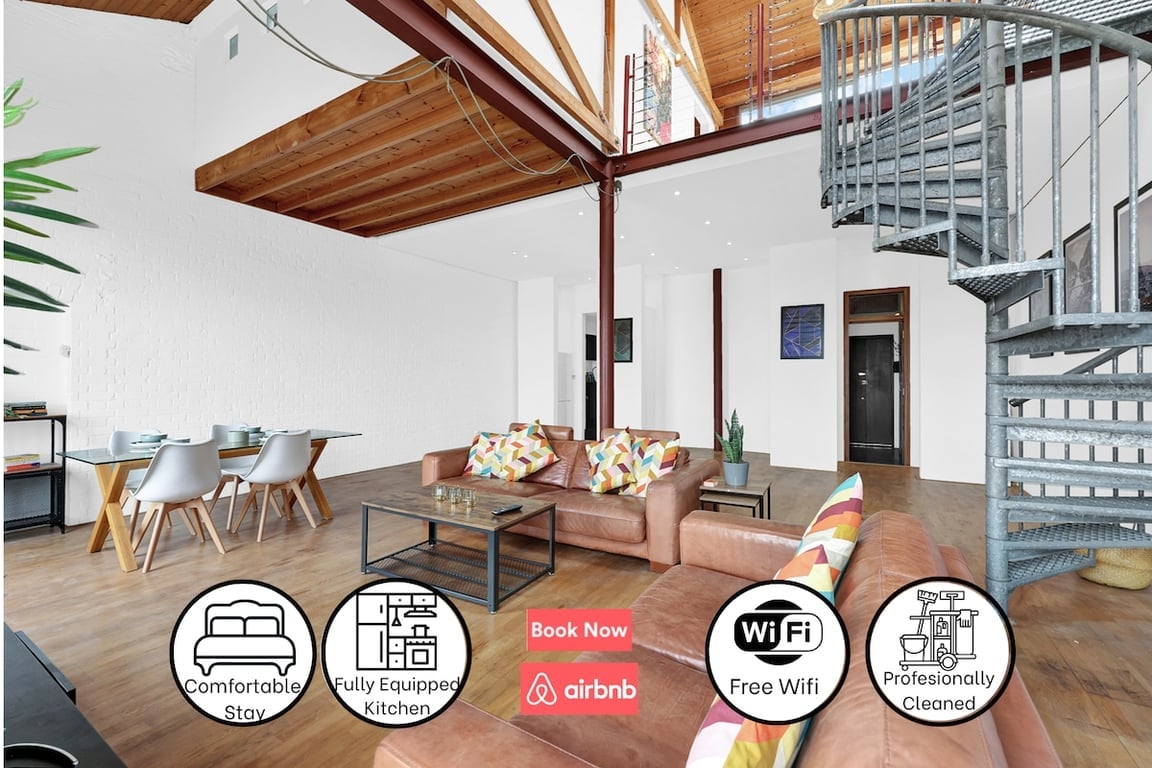 โ Unique 2-level Victorian factory apartment with original industrial features, high ceilings, and large windows.