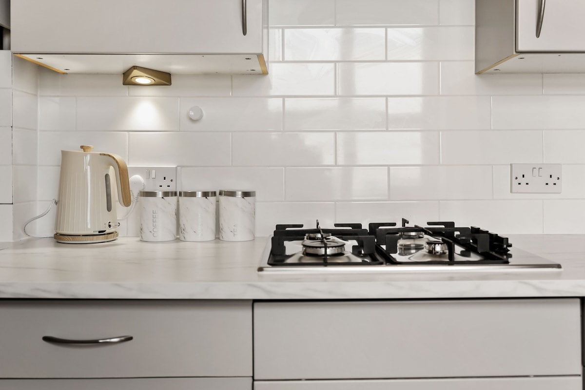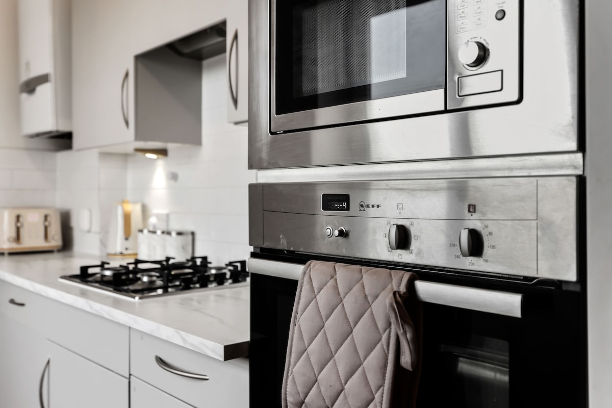 โ The modern kitchen comes with all appliances and plenty of storage and counter space.
