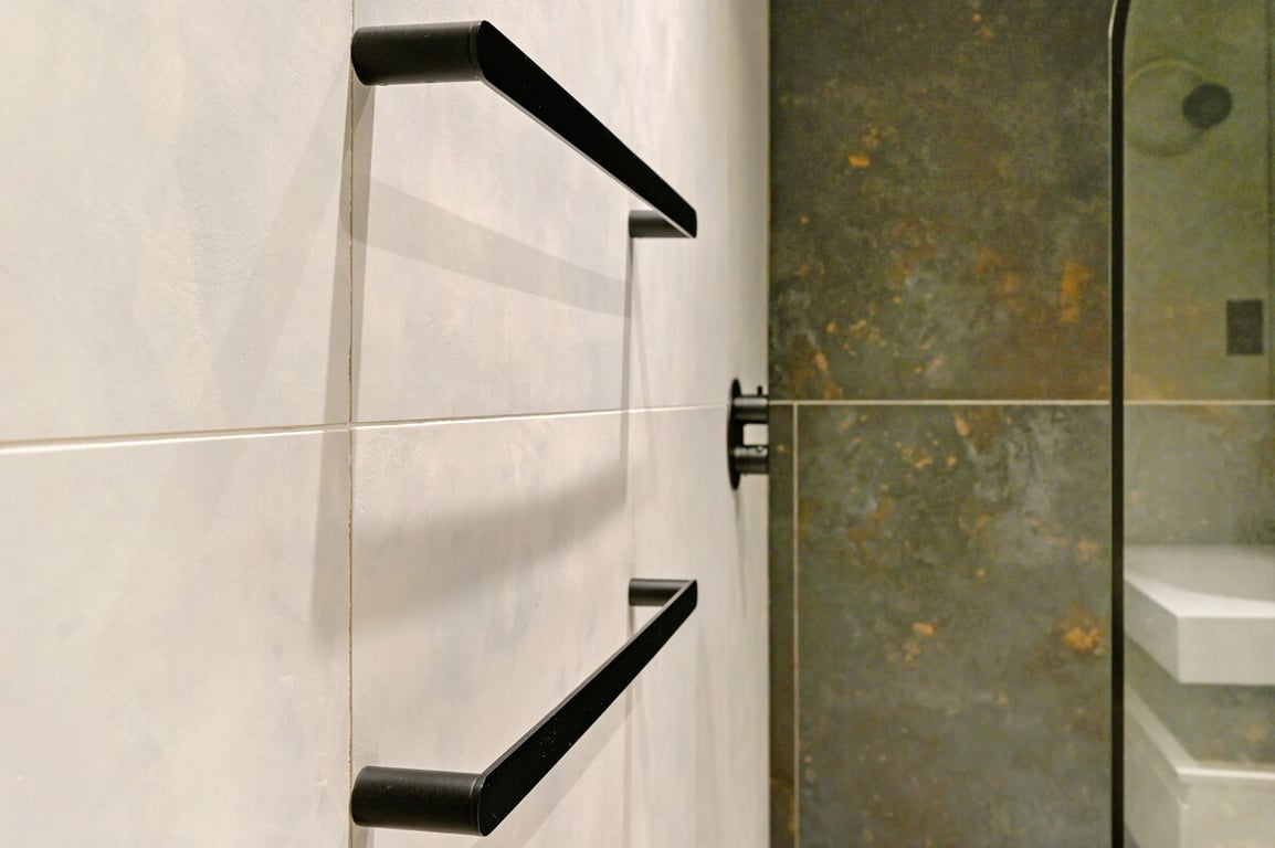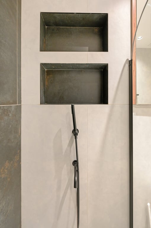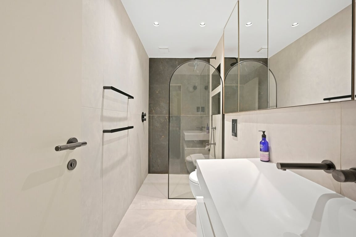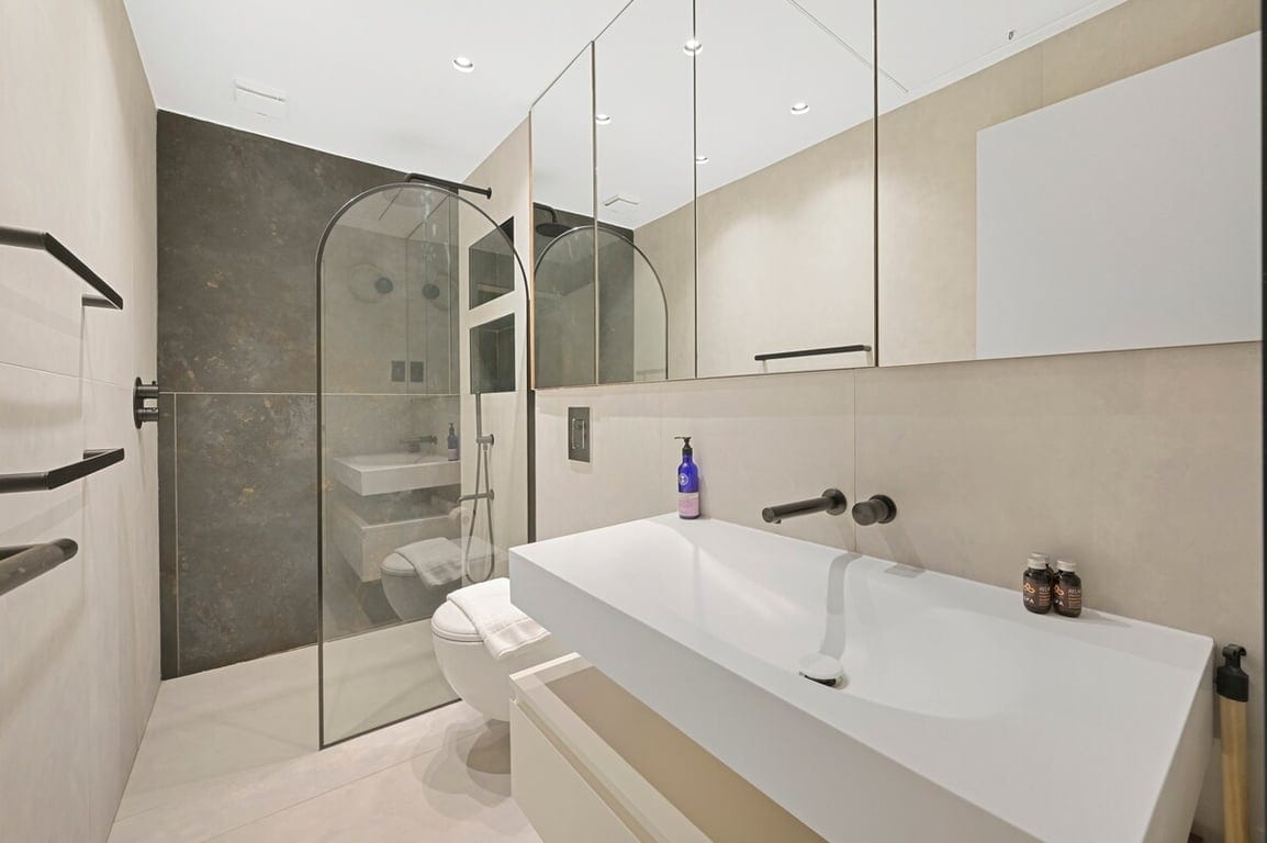 The modern bathroom includes a walk-in shower and is designed to offer a clean, comfortable space with everything you need during your stay.