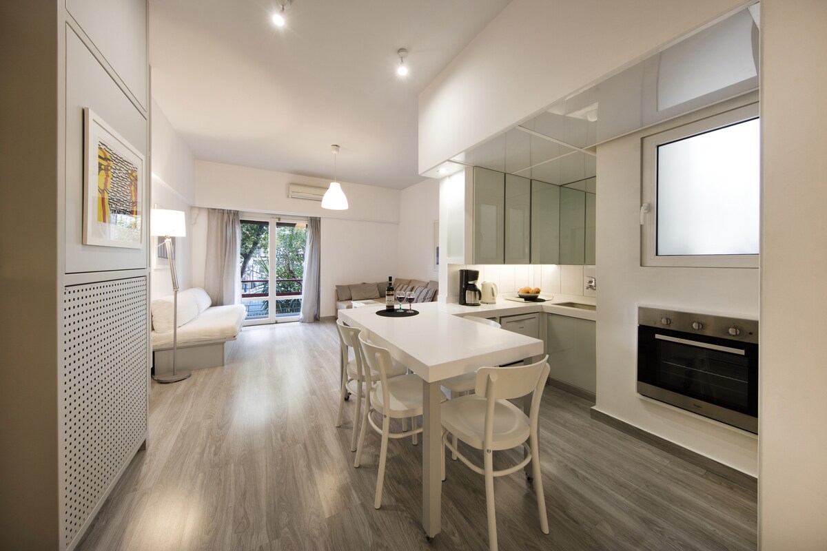 The apartment is located next to Pedion tou Areos, one of the largest park in Athens and only 6 minutes away from the National Archaeological Museum. In a vibrant area near Exarchia, with bohemian atmosphere full of beautiful cafes and rock-jazz bars. The apartment is great for couples, as well as business people as it is perfectly located in the center of the city with access to various transportation options, all within a 6 minutes walk. A stylish apartment ideal for up to 4 people which has a minimalistic and industrial decor. It consists of a spacious bedroom and a combination of a living room and an L-shaped fully equipped kitchen. It, also, has two balconies and a stylish bathroom decorated with mirrors. Guests will have the entire apartment at their disposal. We will be only one phone call or a text away for suggestions, help etc We are just a text or a phone call away if you need anything. There are lots of great restaurants and coffee bars within a few minutes walk and on Saturdays there is a food market that takes place nearby. The apartment is situated in the middle of everything in a neighborhood full of life! Ideal for every type of guest! Victoria tube station is a 6 minute walk, hop on the train and after one stop you will be ready to explore the historical center of Athens. Visit acropolis and Acropolis museum, shop at monastiraki, have a coffee at plaka, walk at Dionysiou Areopagitou, a splendid road at the feet of the Acropolis. The choices are endless! There are also many bus stations close to the apartment, with buses running 24/7 transporting you to every single spot in the city. Please note that if you arrive between 21:00 and 23:00, a €15 late check-in fee will apply, payable to our colleague who will welcome you.For arrivals between 23:00 and 09:00, the only option is to use our taxi service.