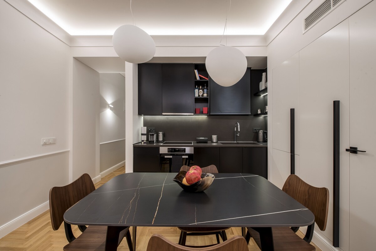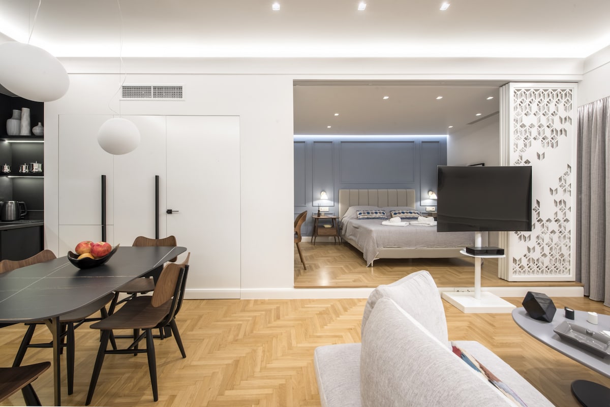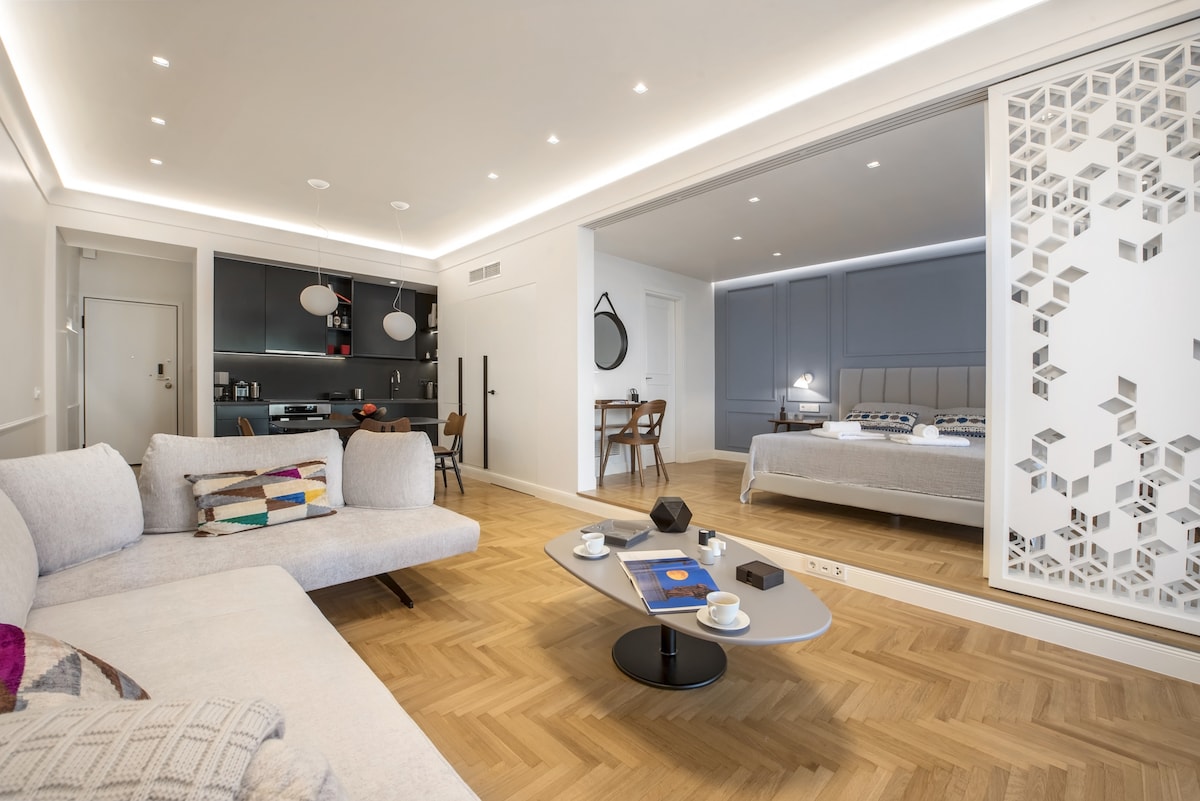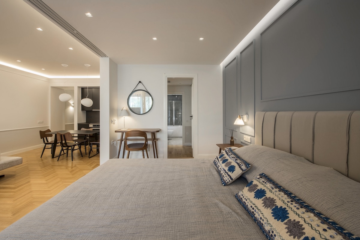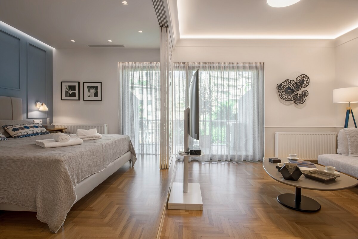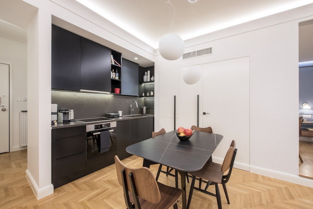Stay in this gorgeous designer home in the very center of Athens, just a few steps from the metro and close to some of the city’s best restaurants, bars and shopping areas. The apartment is right opposite the Us embassy and Athens’ Concert Hall, very close to a number of Athenian hospitals, fertility and beauty clinics, and very conveniently located for the city’s university campus. This is a great base from which to explore the city in style and comfort. This spacious one bedroom apartment is set in one of Athens' most central spots, in a 1960s heritage building. It has just been completely renovated by a well-known team that turned it into an chic, minimal open plan space with designer features and a relaxed atmosphere. You will enjoy the open-plan living, dining and kitchen area, furnished with top-of-the-range, designer pieces. It exudes an air of elegance, luxury and calm overlooking Athens' busy central avenue. The bathroom has also been fully renovated to exceptionally high standards. Guests will have exclusive access to the entire apartment . We are not on the premises but we are just a phone call or a text away should you require help or advice. You will be staying right opposite one of the city's most popular squares, Mavilli Sq. with its well-known bars, restaurants and galleries. The Megaron Metro Station is just a few steps away as is the Athens Concert Hall, numerous hospitals ( Ippokrateion, Alexandra, Children's Hospital, Laiko, Euroclinic etc.), medical centres and Serum Clinic. Just a few minutes' walk away you will find some of Athens' best restaurants and a little bit further you will be shopping in Kolonaki, the city's most upmarket neighbourhood. Syntagma, the Acropolis, sights and major museums are all just a short metro or taxi ride away. Catch a taxi right outside the front door at any point of the day or walk a minute to reach the metro station. You will also be able to use the city's buses. Please be advised that parking is tightly contolled in the area throughout the day. However there are a number of garages you could use to park your car for a fee.Please note that if you arrive between 21:00 and 23:00, a €15 late check-in fee will apply, payable to our colleague who will welcome you.
