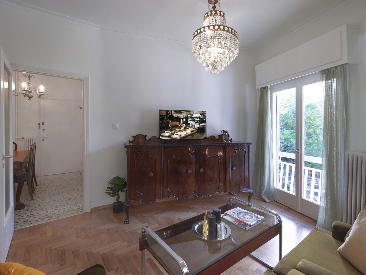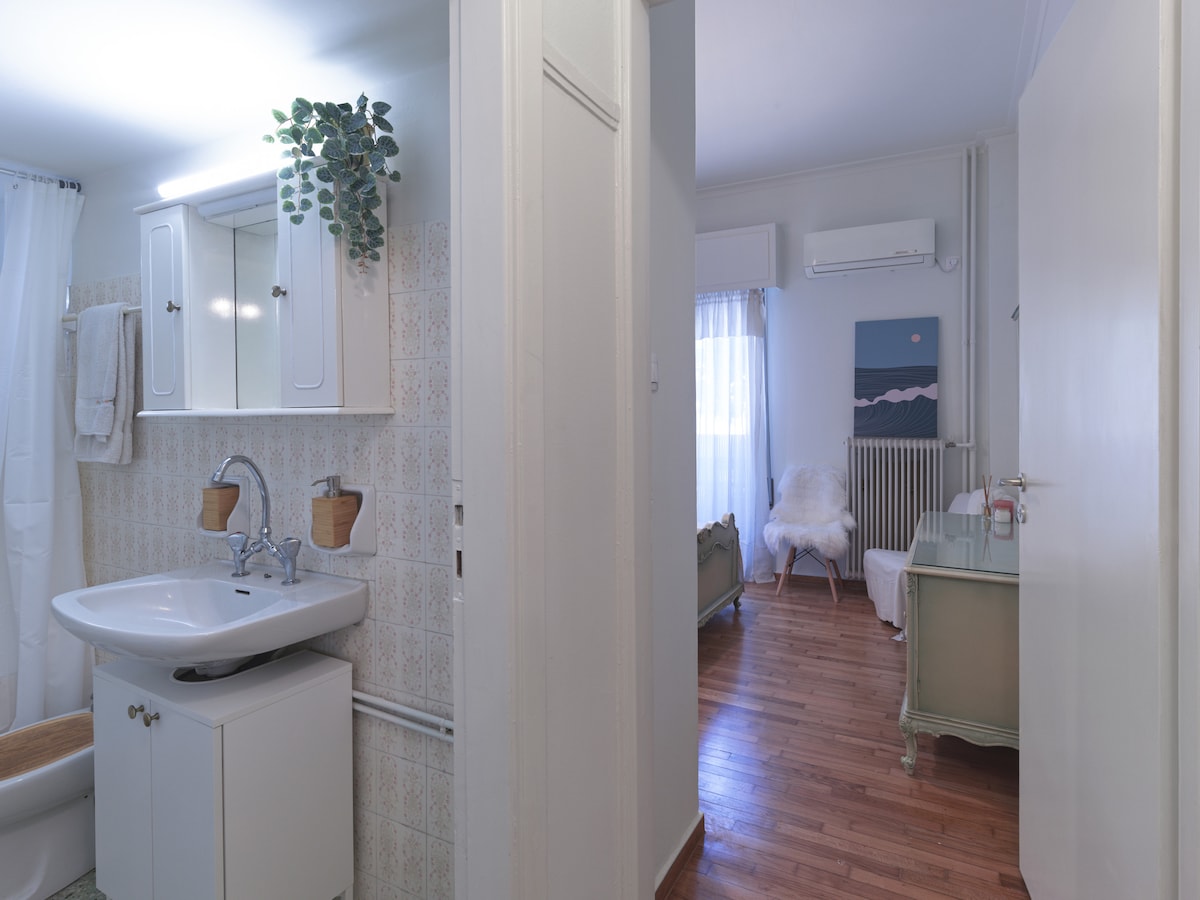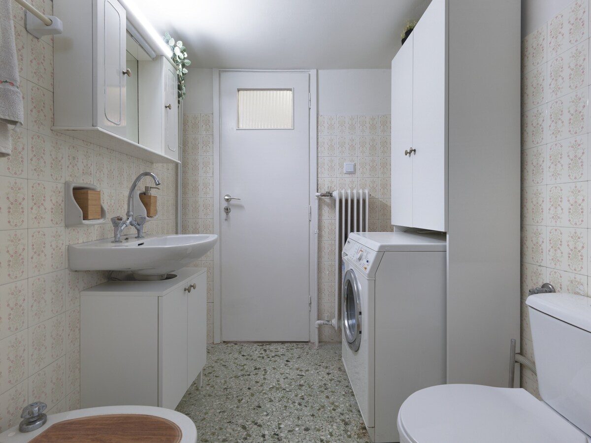 Timeless charm. This one bedroom space is a testament to our deep appreciation for vintage aesthetics, seamlessly blending the elegance of the 60s and 70s with modern comforts. Mosaic floors lay the foundation for this unique space. The living room is a perfect fusion of old and new, with carefully selected vintage furniture pieces that resonate with the past. It's a space where nostalgia meets contemporary style, creating an ambiance that's both inviting and intriguing. In the kitchen, you'll find a mix of vintage charm and modern functionality. It's equipped with all the conveniences you need, allowing you to prepare your favorite meals. The bedroom is generously spacious, providing a restful escape where you can unwind in the comfort of a bygone era. The combination of old and modern pieces in this room creates a unique, serene atmosphere. A retro, spacious bathroom compliments the set up, also adding a touch of old-world lux to the picture. This one-bedroom apartment in Vyronas is a beautiful blend of vintage allure and contemporary comfort. It's a space where the past gracefully mingles with the present, promising you an interesting stay. Come and experience the best of both worlds in this delightful place. If you arrive between 21:00 and 23:00, a €15 late check-in fee will apply, payable to our colleague who will welcome you.For arrivals between 23:00 and 09:00, the only option is to use our taxi service.