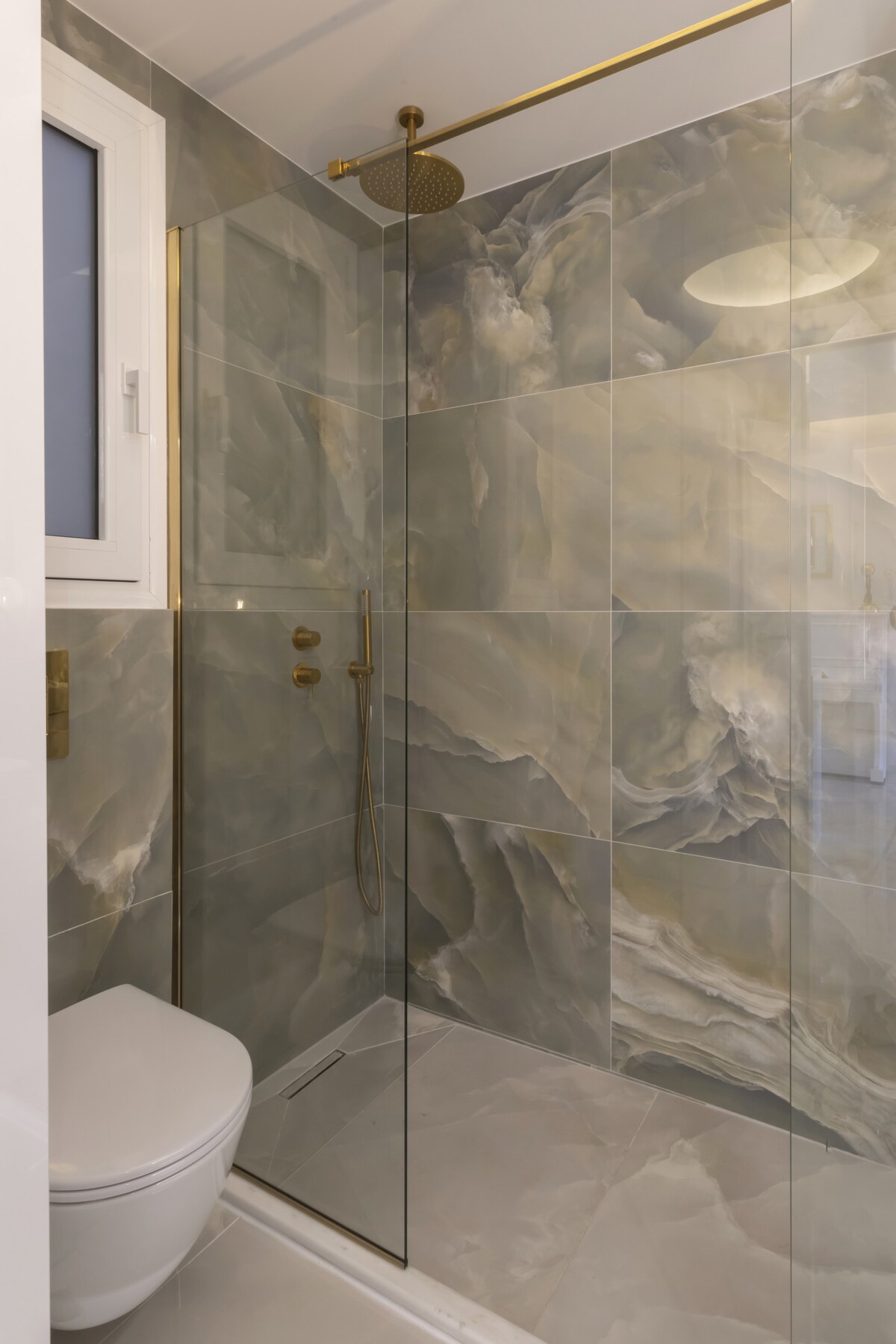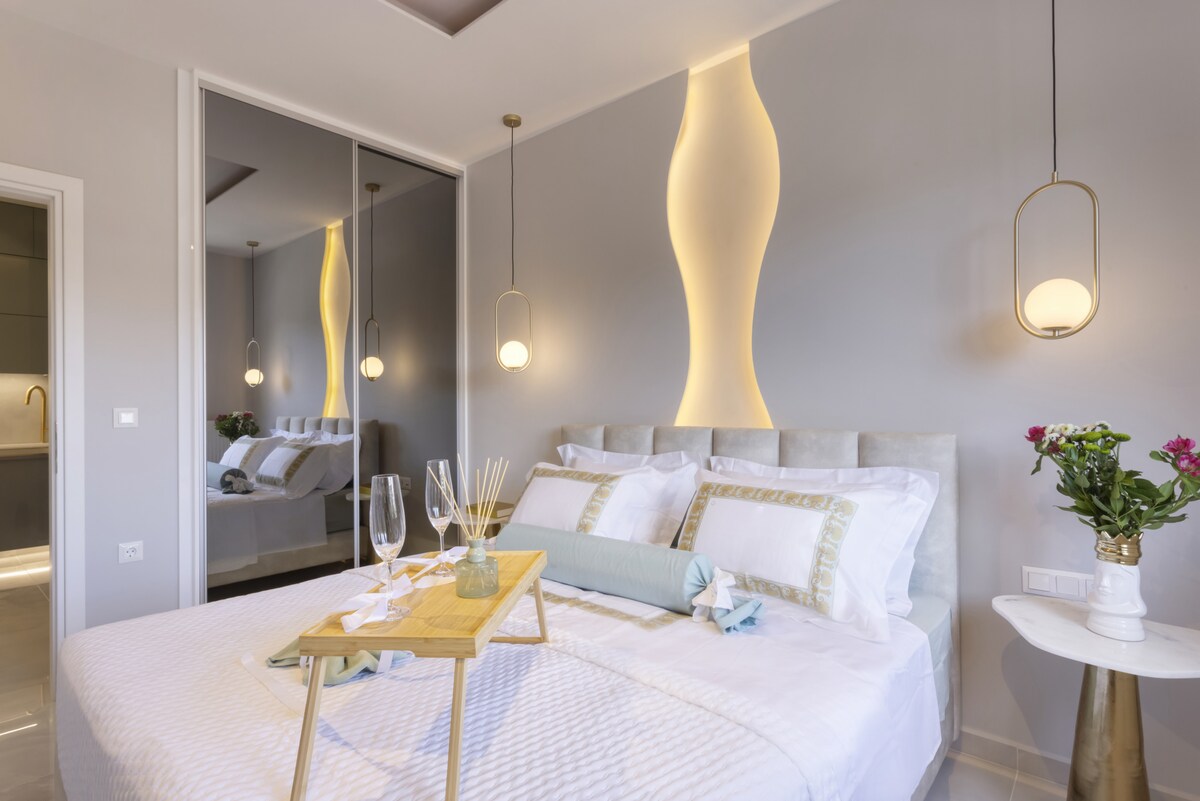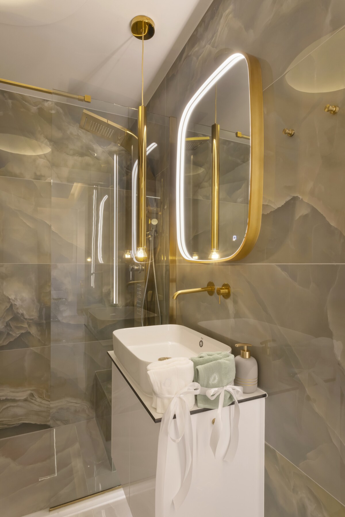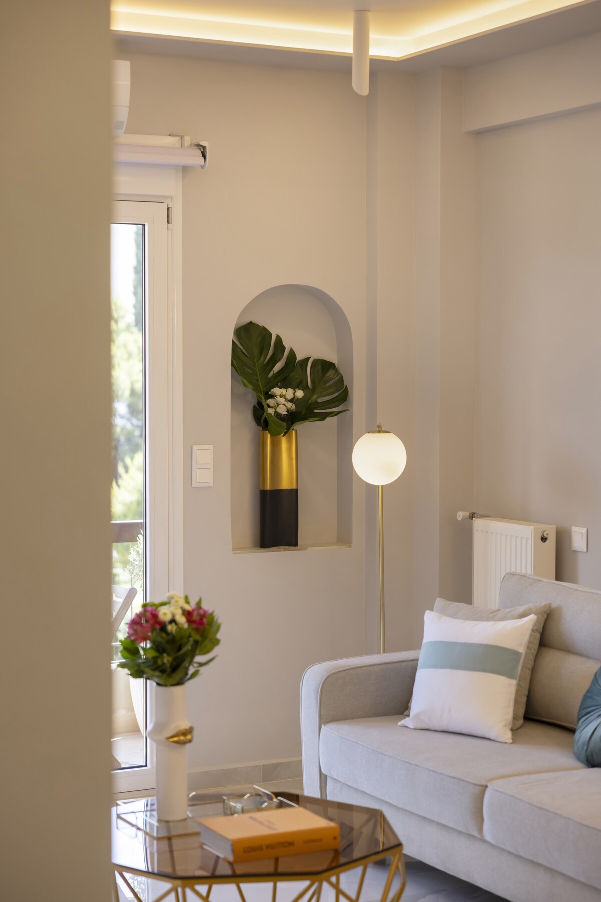 Welcome to our luxurious one bedroom apartment situated in the heart of Nea Smirni, on Chrysostomou square! This stylish space is accentuated by elegant gold details and contemporary furnishings throughout. The open plan kitchen is not only a chef's delight but also a perfect place to socialize with bar stools for casual dining.