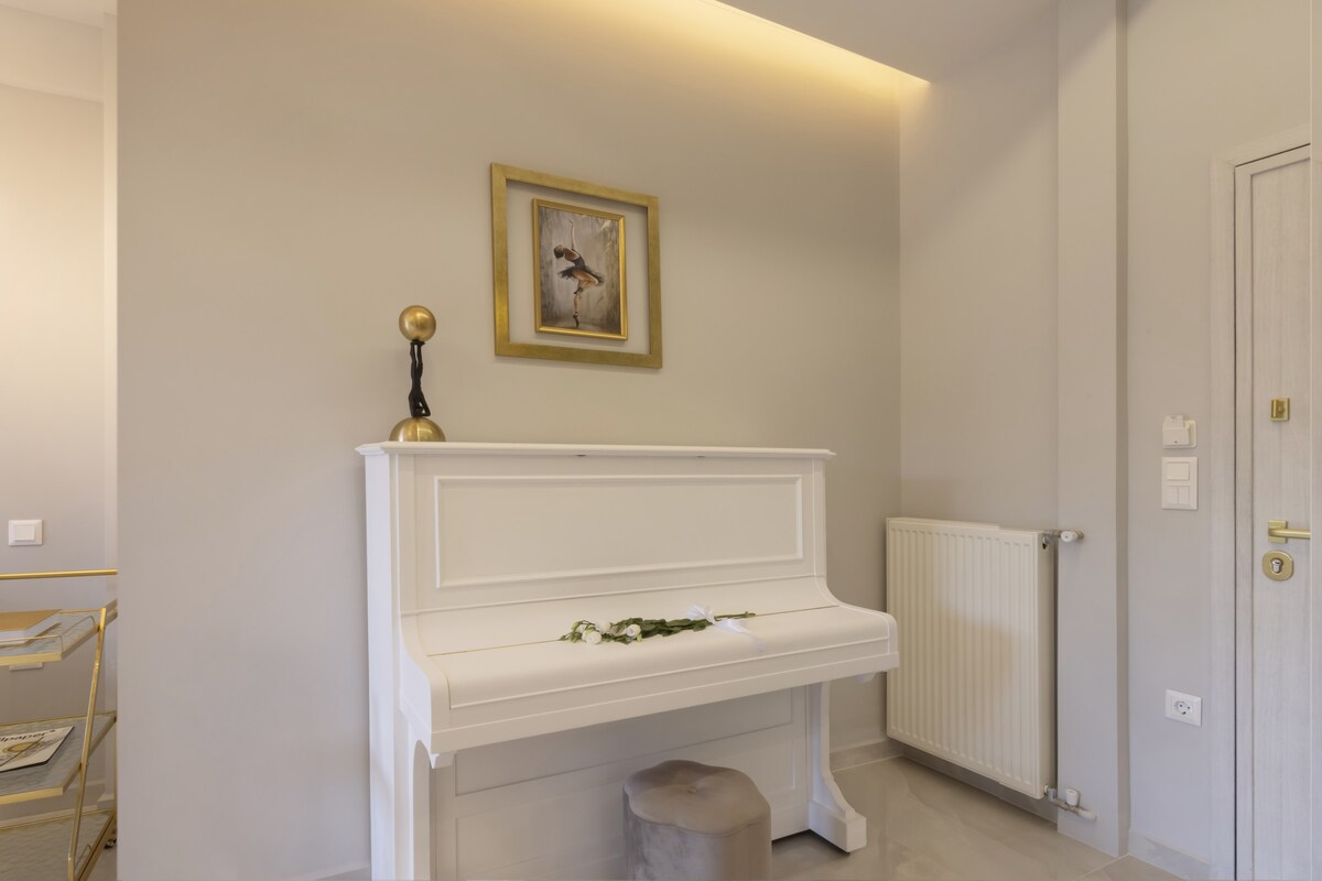 Welcome to our luxurious one bedroom apartment situated in the heart of Nea Smirni, on Chrysostomou square! This stylish space is accentuated by elegant gold details and contemporary furnishings throughout. The open plan kitchen is not only a chef's delight but also a perfect place to socialize with bar stools for casual dining. Music lovers will appreciate the presence of a beautiful white piano, inviting you to create melodic tunes during your stay. Step out onto the balcony and relax in the fresh air while enjoying your morning coffee or a glass of wine in the evening. The balcony is furnished with tables and chairs, offering a lovely space to unwind and soak in the vibrant atmosphere of Nea Smirni square. For entertainment, unwind in front of the impressive 75" Tv, where you can catch up on your favorite shows or movies in style. Whether you're here for business or leisure, this apartment provides a comfortable and chic retreat in a prime location. The shower is equipped with jets, for massaging while showering Experience the perfect blend of luxury, convenience, and character at our one bedroom apartment in Nea Smirni square. Book your stay with us today!If you arrive between 21:00 and 23:00, a €15 late check-in fee will apply, payable to our colleague who will welcome you.