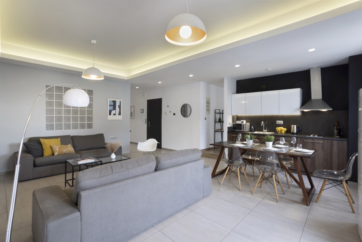 This spacious apartment is ideal for large groups or families. Situated on the 8th floor, it offers stunning views, including breathtaking sights of the Acropolis. The building conveniently includes an elevator for easy access. The terrace is sure to become your favorite spot for unwinding, while the modern, wood-accented kitchen invites you to make use of it. The warm color palette throughout the apartment creates a cozy, homey atmosphere. With three generously sized bedrooms, the apartment comfortably accommodates six guests, along with ample storage in a few wardrobes. Its standout feature is the prime location, just a 5-minute walk from Syntagma Square. The vibrant neighborhood is filled with charming cafes, restaurants, and bars, while the famous Ermou Street, a hub for markets and shops, is also only 5 minutes away. Don’t miss the area’s renowned cult bars for a unique local experience!Please note there is a charge of €15 for check in between 21:00 pm-23:00 pm, which is paid in cash upon arrival.