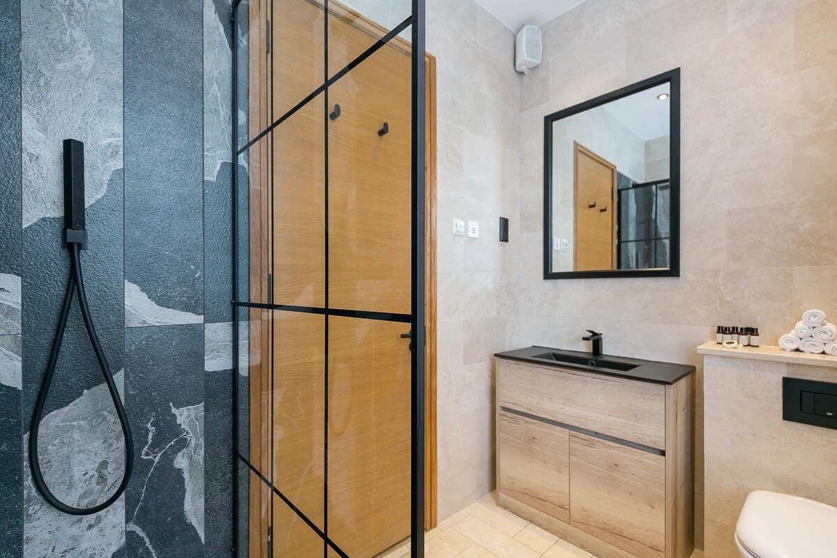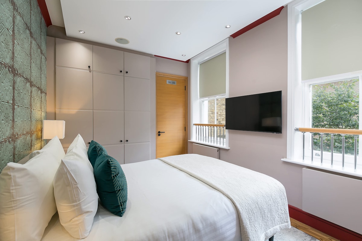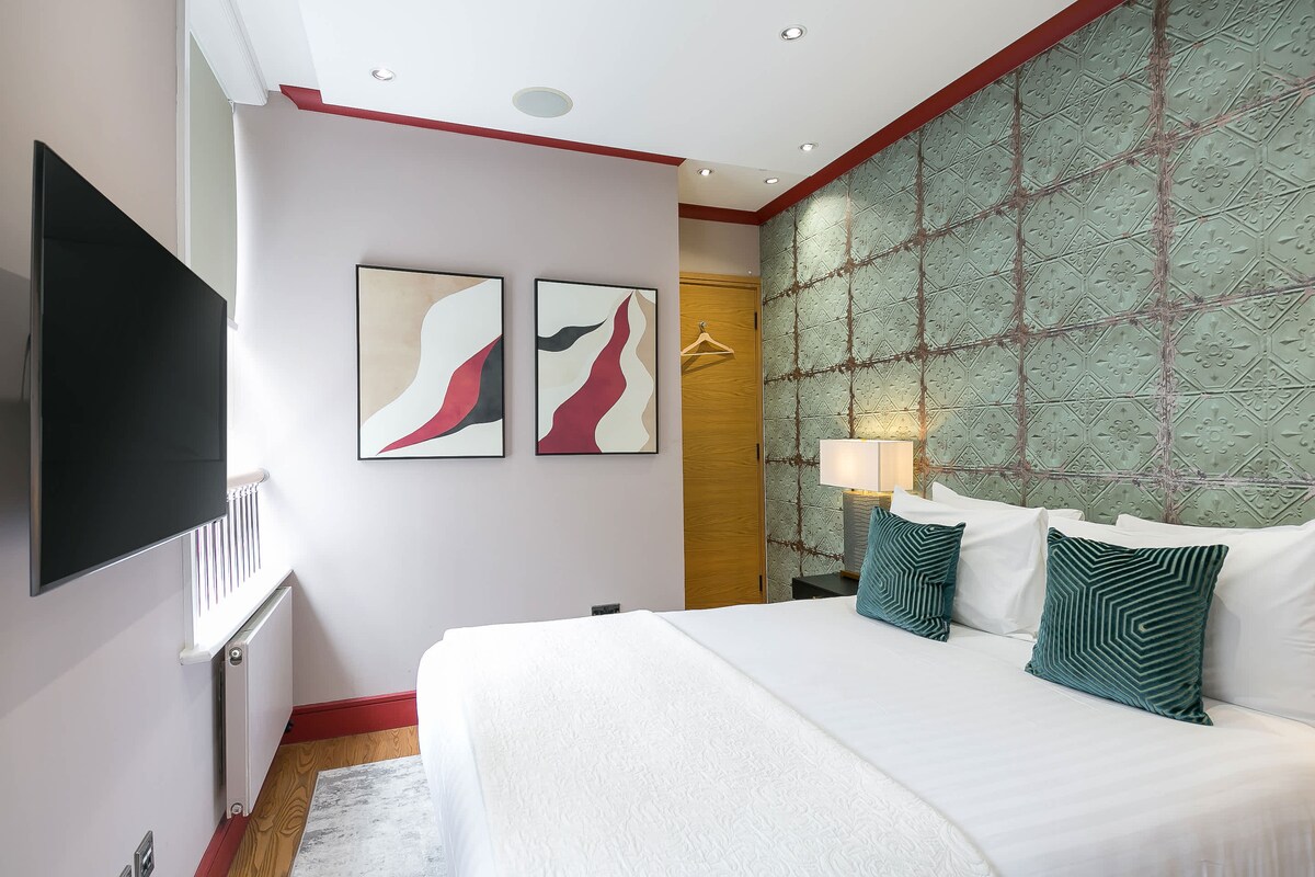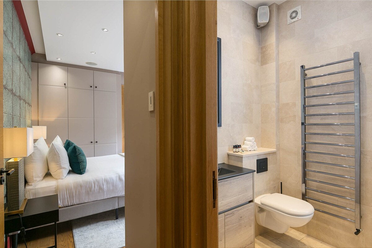 The open-plan living area is flooded with natural light, featuring a sofa bed, Smart TV, and contemporary décor. The king-size bedroom is a calm retreat with designer touches and built-in storage. A dining area sits beside the fully equipped kitchen, perfect for meals or planning your evening in London. The sleek bathroom includes a walk-in rainfall shower and premium finishes. Weekly housekeeping is provided for extended stays, and thoughtful welcome amenities ensure a comfortable arrival.