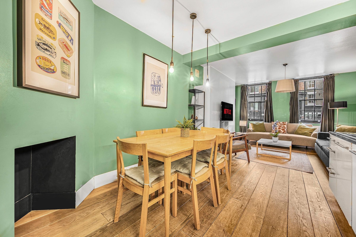 This spacious 2 bedroom, 1 bathroom duplex apartment offers approx. 765 sq ft / 71 sq m of living space set over the ground and lower ground floors on charming Goodge Place in Fitzrovia.✔ Open Plan Living & Dining - comfortable sofa bed, Smart TV and dining space for 6