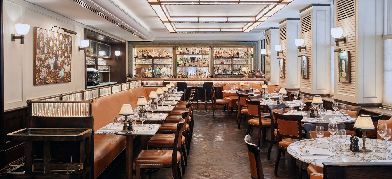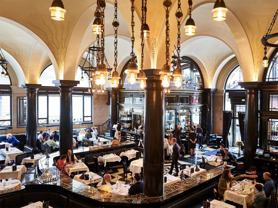 Located on Piccadilly, The Wolseley is an all-day café-restaurant in the grand European tradition. Celebrities such as Tom Hardy and Chris Martin frequent this spot. The Wolseley is known for its beautiful architecture and classic menu, including Wiener schnitzel and choucroute. The interior features marble floors, high ceilings, and opulent chandeliers, making it a glamorous setting for any meal. The private dining room, The Wolseley Room, provides an intimate space for special occasions.